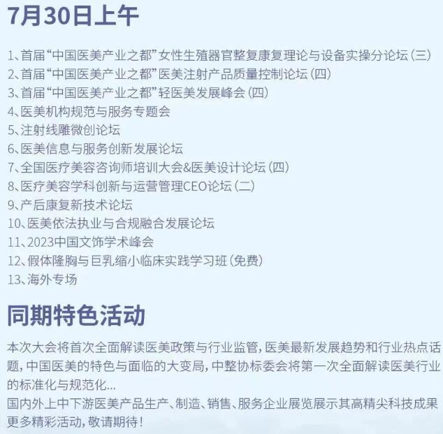 为进一步贯彻推进建设健康中国的国家战略部署,由中国整形美容协会和海南省卫生健康委员会共同主办的首届“中国(海南)医美产业之都高峰论坛暨博览会”将于2023年7月28-30日在海口国际会议展览中心举办。本次大会就医美产业新发展趋势和行业热点话题、 医疗美容行业的标准化与规范化、中国医美的特色与面临的大变局及医美产业政策与行业监管等主题展开分论坛交流。