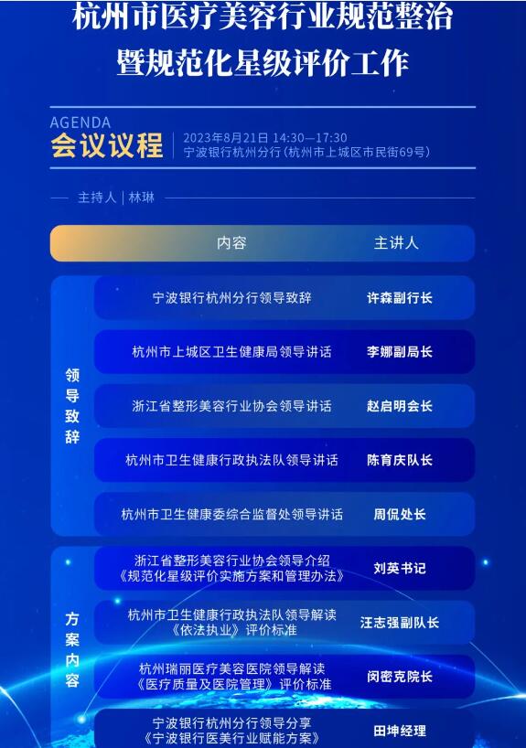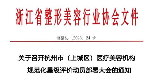 为贯彻落实浙江省人民政府《关于进一步扩大消费促进高质量发展若干举措》(办公厅【2023】26号文件),《关于进一步加强医疗美容行业监管工作的指导意见》(国家市场监督管理总局【2023】22号文件),进一步提升杭州市医疗美容行业规范化水平,打造品质医美之都,受杭州市卫生健康行政执法队委托,决定召开杭州市(上城区)医疗美容机构规范化星级评价动员部署大会,会议通知如下: