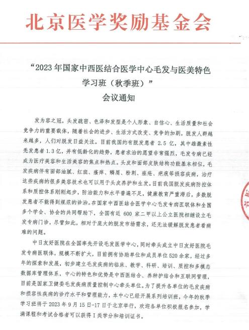 为了提升各单位的毛发疾病和损容性疾病的诊疗水平和管理能力,本中心已经开展系列培训班,今年的秋季学习班将于2023年9月15日-17日于北京举行,欢迎各单位积极报名参加,学满课程和考试合格者可以获得I类学分和培训证书。