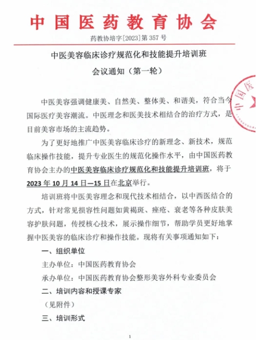为了更好地推广中医美容临床诊疗的新理念、新技术,规范临床操作技能,提升专业医生的规范化操作水平,由中国医药教育协会主办的中医美容临床诊疗规范化和技能提升培训班,将于2023年10月14日—15日在北京举行。