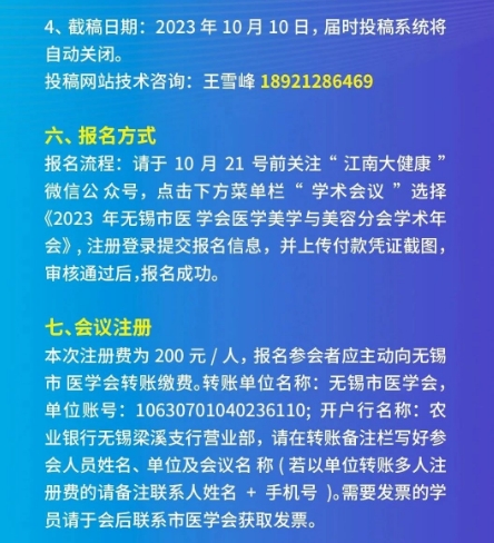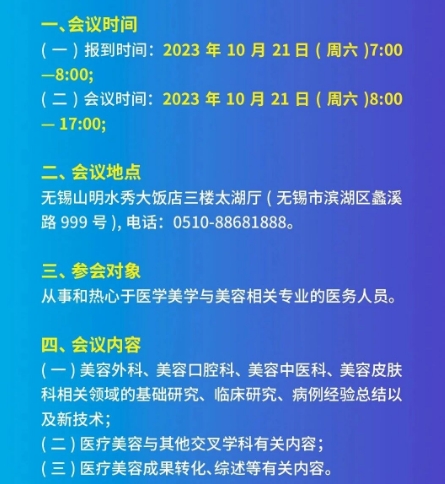 在社会经济快速发展、医疗美容水平日新月异的当下,为促进无锡市及周边地区医学美容专业的交流与合作,提高医疗美容规范化诊疗水平,由无锡市医学会医学美学与美容分会主办的 2023 年无锡市医学会医学美学与美容分会学术年会(项目编号:23010230411001)将于近期在无锡召开。会议采用专家专题讲座和论文交流的方式进行,届时将邀请国内著名专家学者作专题报告,并就医学美容领域的前沿问题、疑难问题与参会者交流。会议内容丰富,欢迎广大同仁积极参与。现将会议有关事宜通知如下: