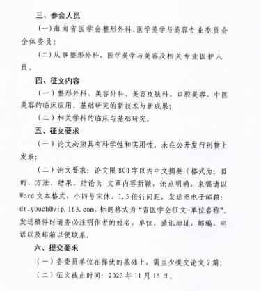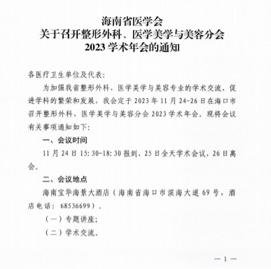 为加强我省整形外科、医学美学与美容专业的学术交流,促进学科的繁荣和发展,我会定于2023年11月24-26日在海口市召开整形外科、医学美学与美容分会2023学术年会。现将会议有关事项通知如下:
