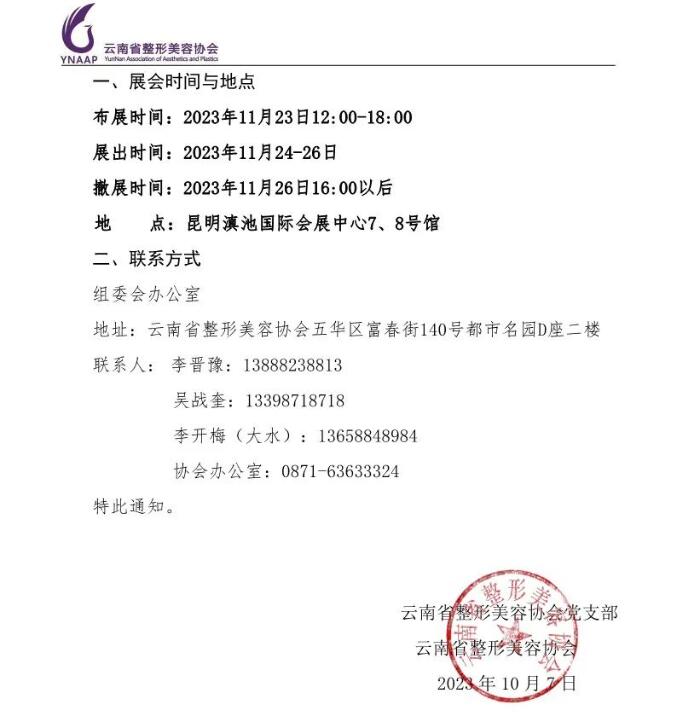 为进一步加强行业交流与合作,扩大展会影响力,推动医美行业健康发展。经过协会办公会多次研究讨论,决定于2023年11月24日至26日在昆明滇池国际会展中心正常举办2023思可美·云南国际医疗美容产业博览会(以下简称2023思可美医美博览会)。