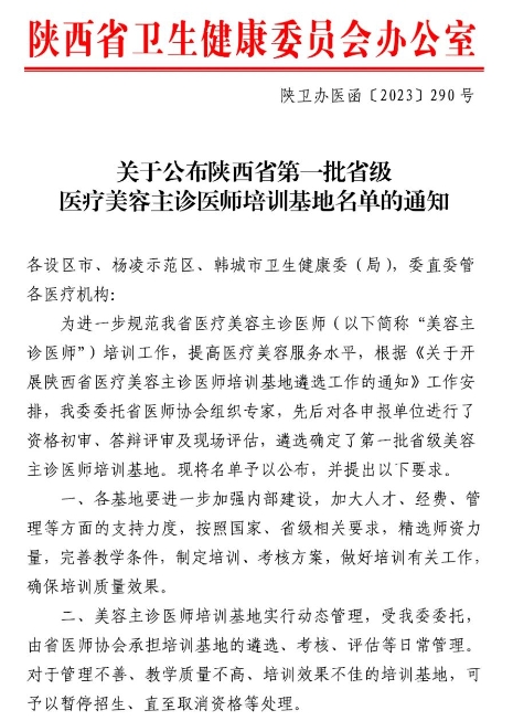 为进一步规范我省医疗美容主诊医师 (以下简称“美容主诊医师”) 培训工作,提高医疗美容服务水平,根据《关于开展陕西省医疗美容主诊医师培训基地避选工作的通知》工作安排,我委委托省医师协会组织专家,先后对各申报单位进行了资格初审、答辩评审及现场评估,遂选确定了第一批省级美容主诊医师培训基地。现将名单予以公布,并提出以下要求。