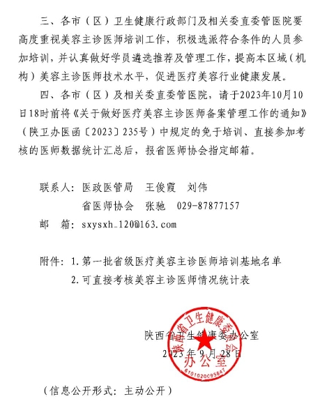 四、各市 (区)及相关委直委管医院,请于2023年10月10日18时前将《关于做好医疗美容主诊医师备案管理工作的通知》(陕卫办医函[2023]235号)中规定的免于培训、直接参加考核的医师数据统计汇总后,报省医师协会指定邮箱。