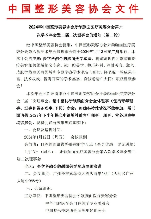 本次年会同期还将举办中国整形美容协会牙颌颜面医疗美容分会二届二次理事会,请中整协牙颌颜面分会全体理事(包括青年理事、理事和常务理事,下同)参会,如确实特殊情况不能参加,需书面请假;2023年下半年提交申请增补的青年理事、理事、常务理事等均须参会。