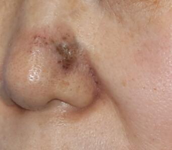老年人常见的皮肤恶性肿瘤之一,常发生在有毛部位的表皮基地细胞或皮肤附件的一种低度恶性肿瘤,主要由间质依赖性多能基底样细胞组成。特点生长缓慢,极少发生转移。多见于头皮、面颈部暴露部。早期表现为表面光亮、边缘隆起的圆形斑片,表皮变薄,伴有雀斑样小黑点,也可表现为淡红色苔藓样皮疹,表面有角化,或伴有溃疡结痂。治疗为手术扩大切除。