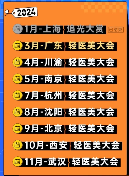 2024年「未来医美大会」将覆盖上海、广东、川渝、南京、杭州、沈阳、北京、西安、武汉等多个省市,相比2023年活动数量将近翻一番,覆盖范围、活动规模、参会企业、观众数量等均将有大幅提升。