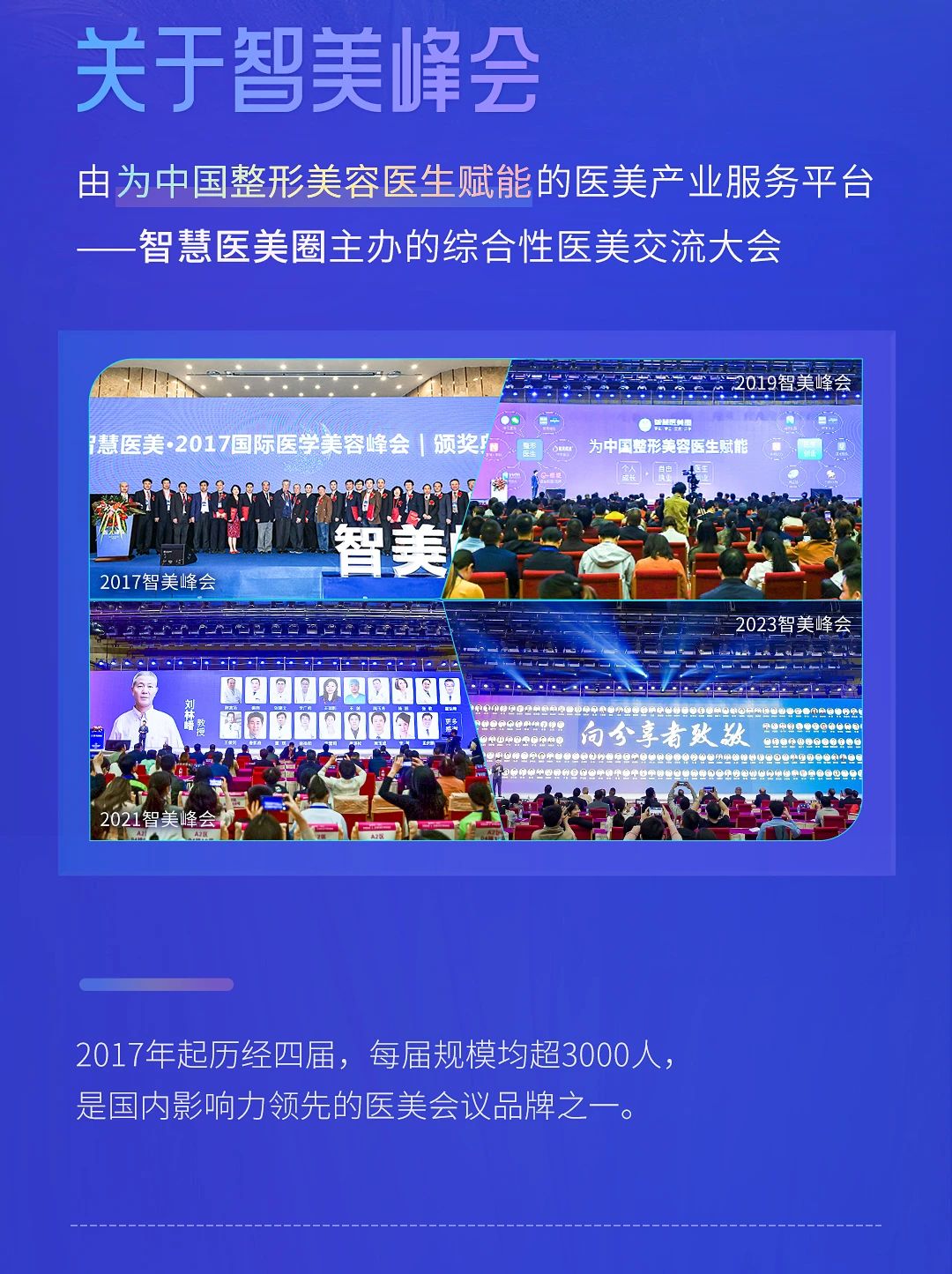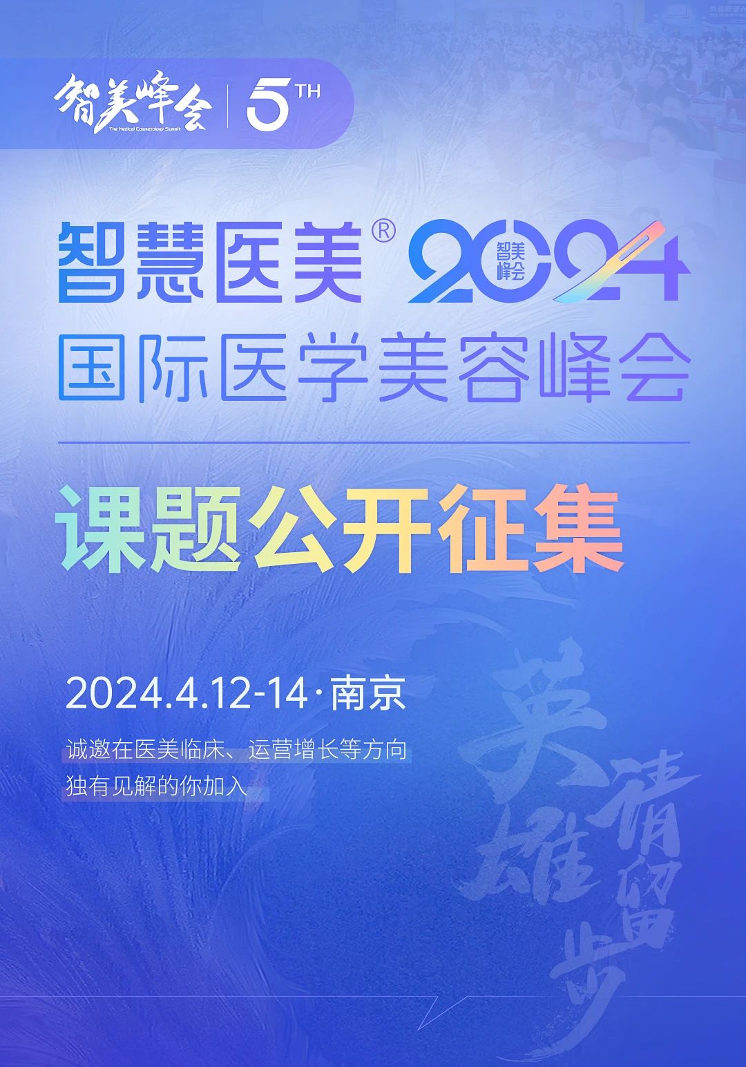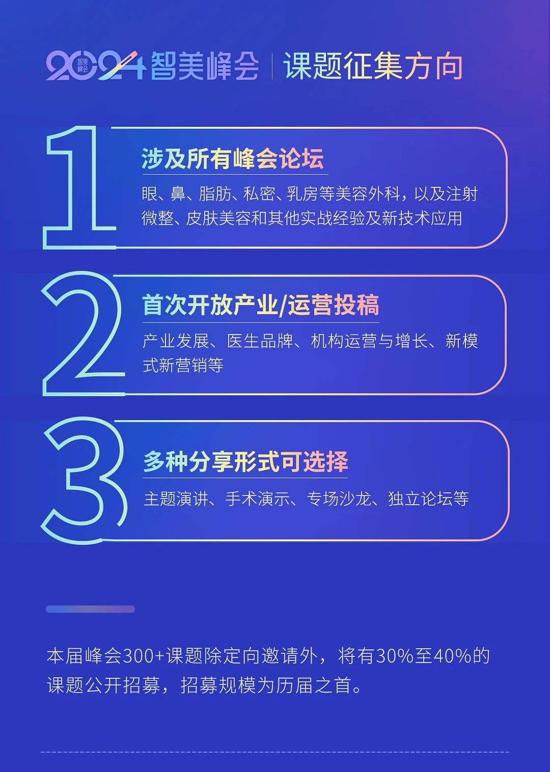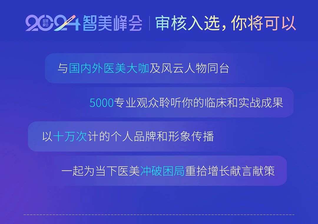 智美峰会举办到第五届,它已不只是行业的大聚会,更是所有医美同行展现自己经验成果的舞台。为此,本届峰会面向全国乃至全球医师和医美同行们发出诚挚邀请,峰会30%以上的分享课题将已征稿的方式确定。