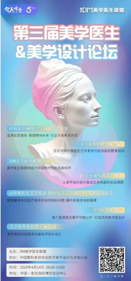 由DM美学医生联盟主办,中国整形美容协会医美设计与咨询分会、紫金美会协办的“第三届美学医生&美学设计论坛”将于2024年4月12-14日在“智美峰会”期间举行。