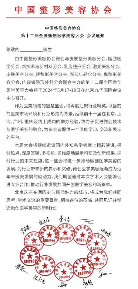 由中国整形美容协会微创与皮肤整形美容分会、脂肪医学分会、新技术与新材料分会、乳房整形分会、光美容分会:皮肤美容分会、眼整形美容分会、面部年轻化分会、鼻整形美容分会、内窥镜整形外科分会联合主办的第十二届全国微创医学美容大会将于2024年5月17-19日在北京九华国际会议中心召开。