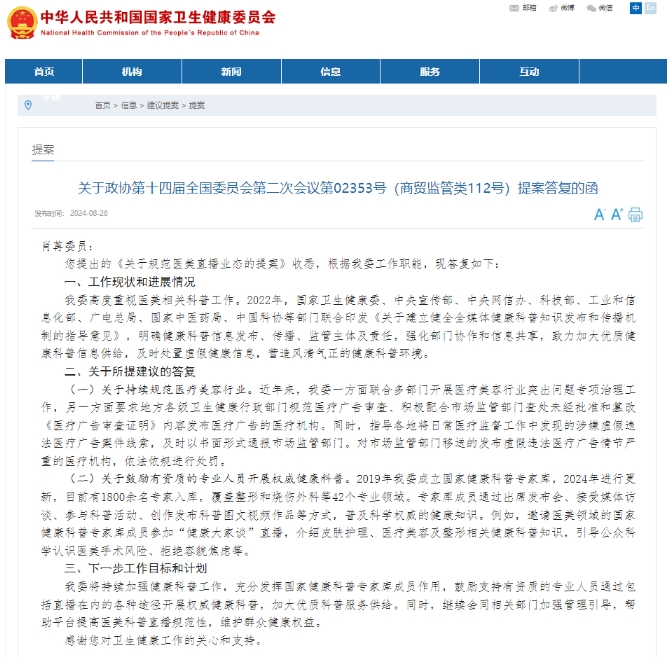 国家卫健委称,近年来,该委一方面联合多部门开展医疗美容行业突出问题专项治理工作,另一方面要求地方各级卫生健康行政部门规范医疗广告审查、积极配合市场监管部门查处未经批准和篡改《医疗广告审查证明》内容发布医疗广告的医疗机构。同时,指导各地将日常医疗监督工作中发现的涉嫌虚假违法医疗广告案件线索,及时以书面形式通报市场监管部门。对市场监管部门移送的发布虚假违法医疗广告情节严重的医疗机构,依法依规进行处罚。